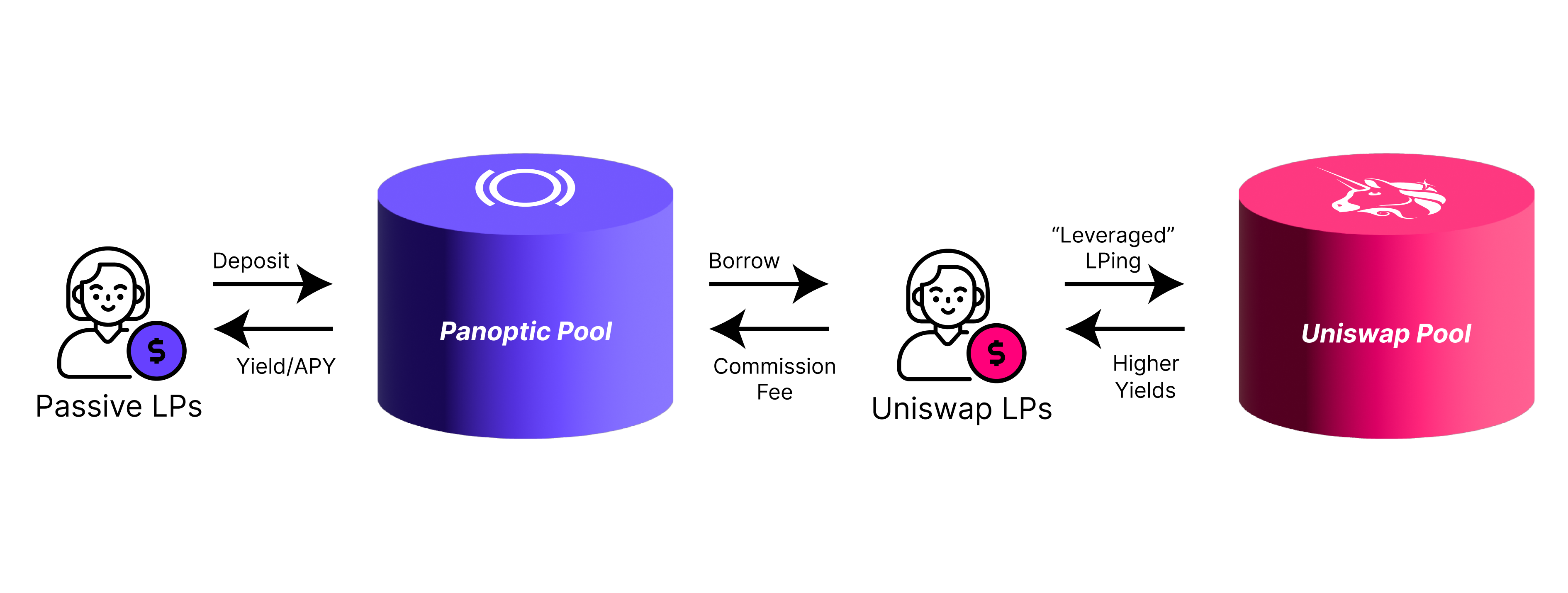 - Traders who want to buy options can take the other side by borrowing LP tokens from active LPs in Uniswap. The LP tokens are burned and the underlying assets are returned to Panoptic’s passive liquidity pool. These traders also pay a fixed fee to passive LPs for doing so.