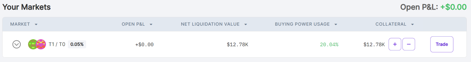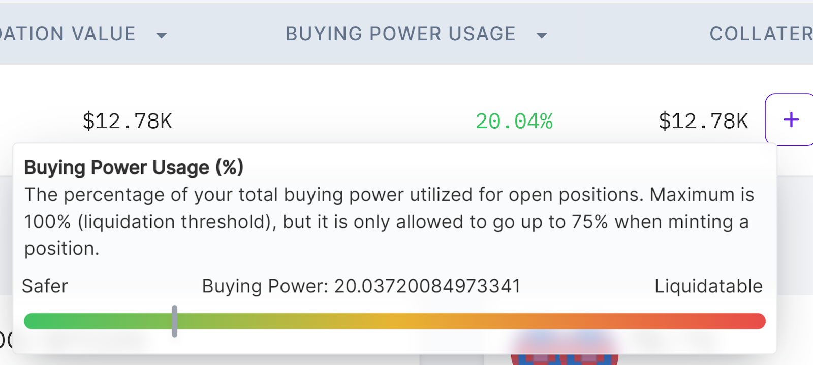 A trader becomes liquidatable if their buying power usage exceeds 100%. Panoptic’s market dashboard allows you to quickly monitor your total buying power usage for all your markets.