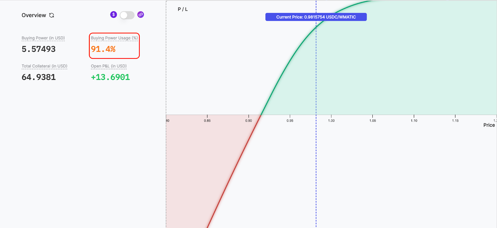 When buying power exceeds 100%, the trader’s account becomes liquidatable because their outstanding collateral requirement surpasses the value of their collateral.