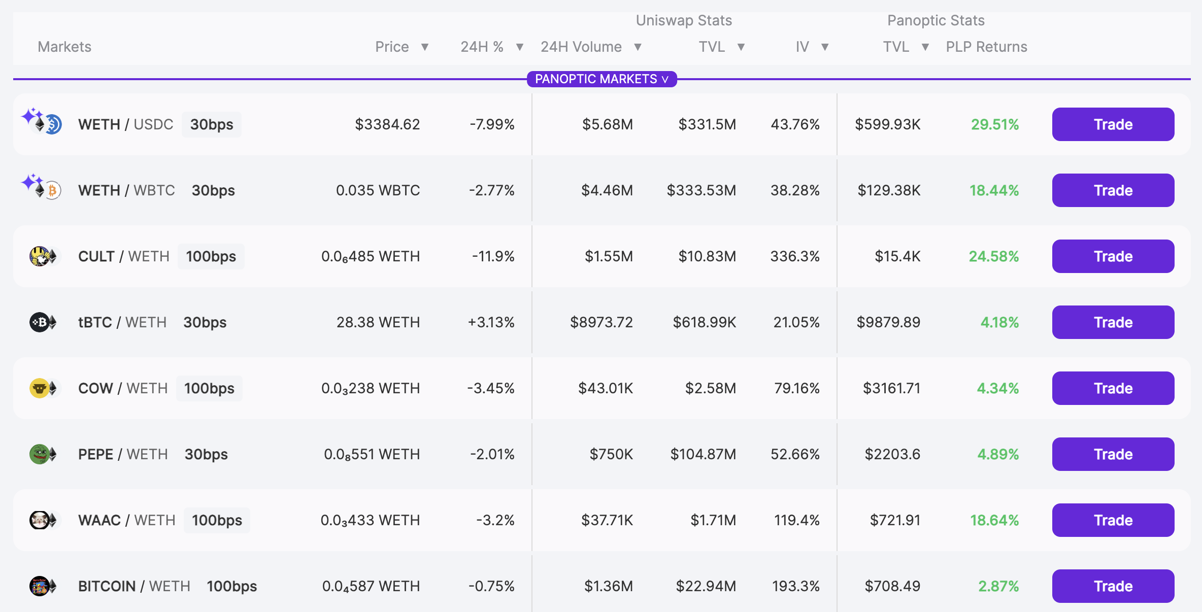 • New Markets: Panoptic offers dozens of perps markets that are not available on other exchanges. Panoptic is able to offer new markets for perps trading on virtually any token tradable on Uniswap thanks to its innovative design that is completely permissionless, oracle-free, and utilizes Uniswap LP positions to create perps and options.