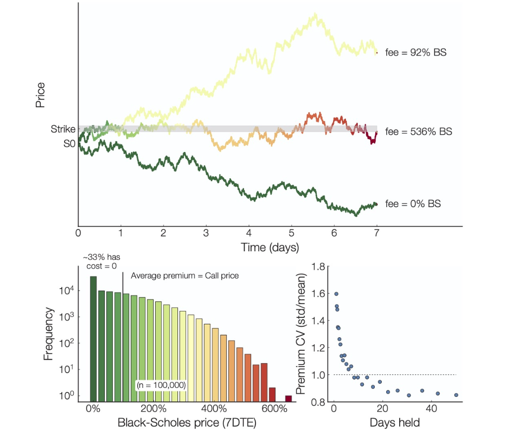 - Bottom left chart: shows that, on average, the premium in Panoptic matches the Black-Scholes price, with a significant portion of simulations resulting in zero premium.