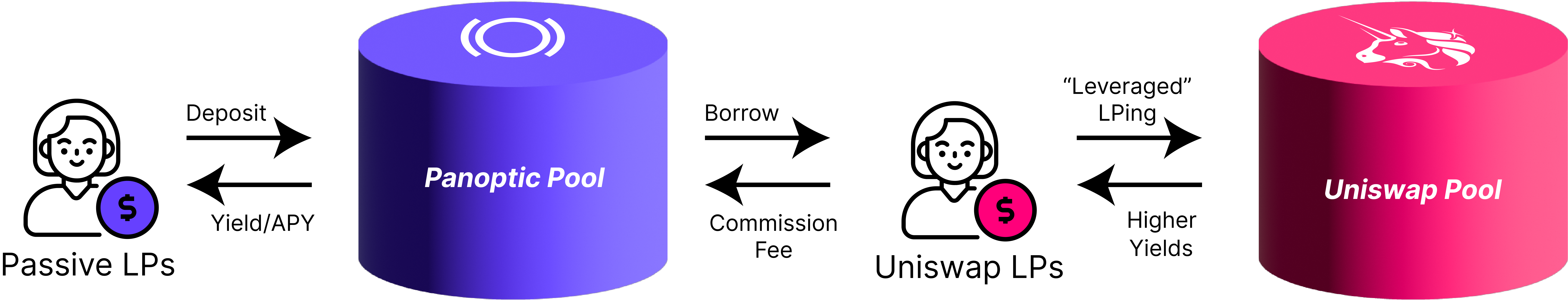 In Panoptic, Uniswap LPs earn, as a baseline, the same fees they would earn on Uniswap. However, they earn additional revenue if there is even a single lender on Panoptic. For instance, if a Uniswap LP earns $100 in fees on Uniswap, they would earn that $100 plus an additional amount on Panoptic. This additional revenue comes from option buyers borrowing LP tokens through Panoptic.